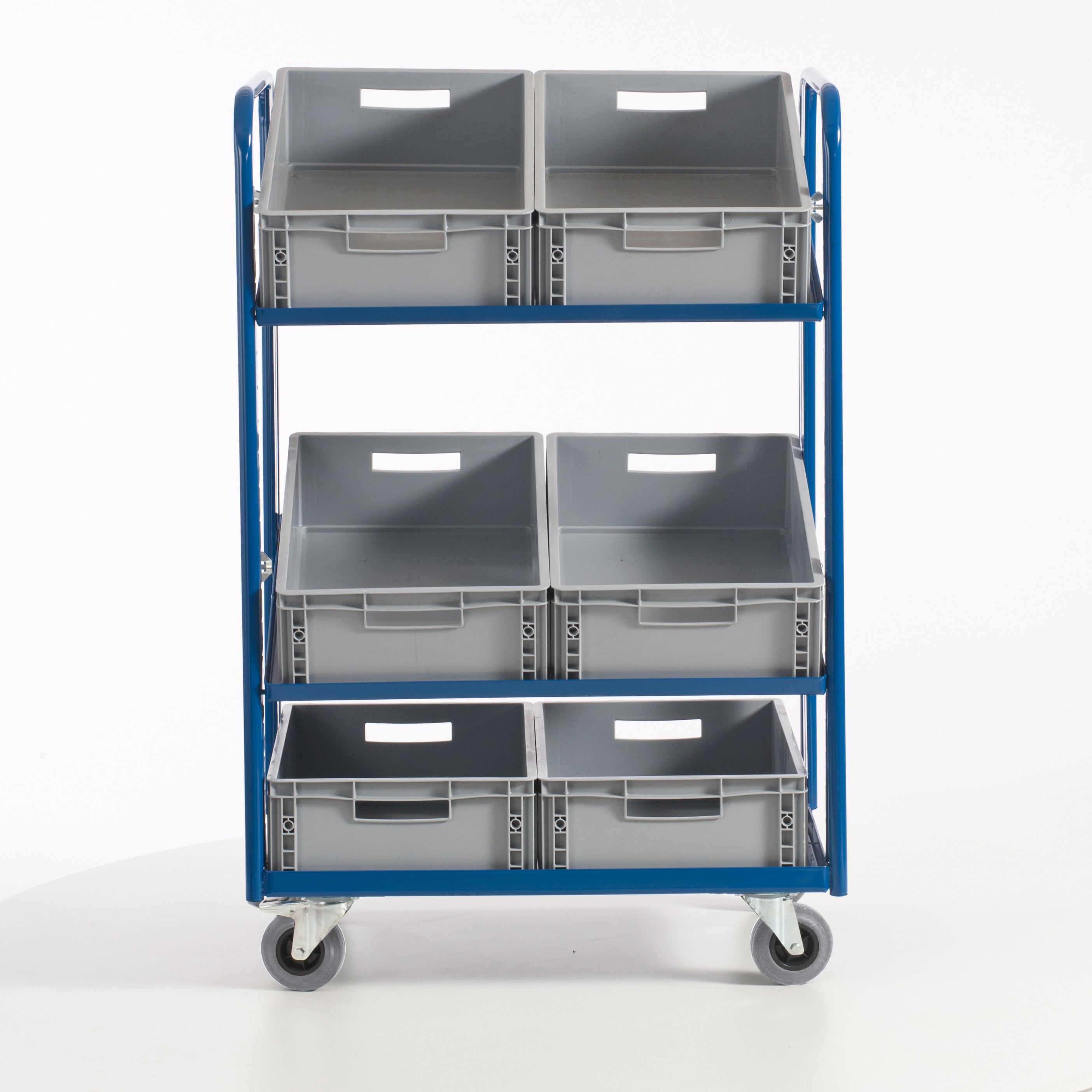 Die Fixierung der Einlegeböden ist in Abständen von 50 mm möglich. Über eine Flügelmutter lassen sich die Böden stufenlos bis 20° neigen. Der überstehende Rand ist je nach Ausführung 15 mm (mit Holzboden) oder 25 mm (offener Rahmen). Im Lieferumfang sind zwei Einlegeböden und ein Grundboden enthalten. Die Tragkraft pro Einlegeboden beträgt max. 60 kg.Lieferumfang: 2 Etagenböden + GrundbodenEurokästen grau, bei dieser Ausführung 600x400x170 mm (LxBxH), 6 Kästen im Lieferumfang enhalten
