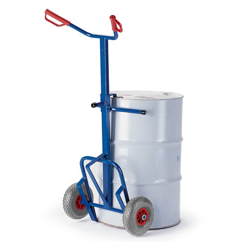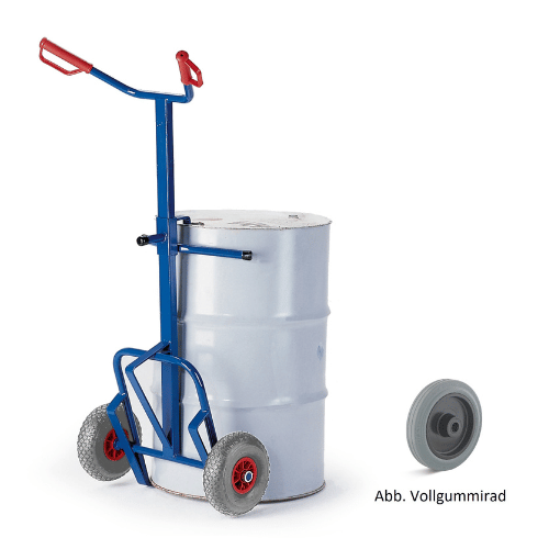Fest verschweißte Stahlkonstruktion. Die beiden unten an die Karre geschweißten Aufnahmeklauen schieben sich unter das Fass. Nachdem der Fassrandgreifer hinter den oberen Rand des Fasses geklemmt wurde, kann das Fass angehoben werden. Für den Transport von 200 Ltr. Stahlblechfässern mit Rand.Für 200 Ltr. Fässer