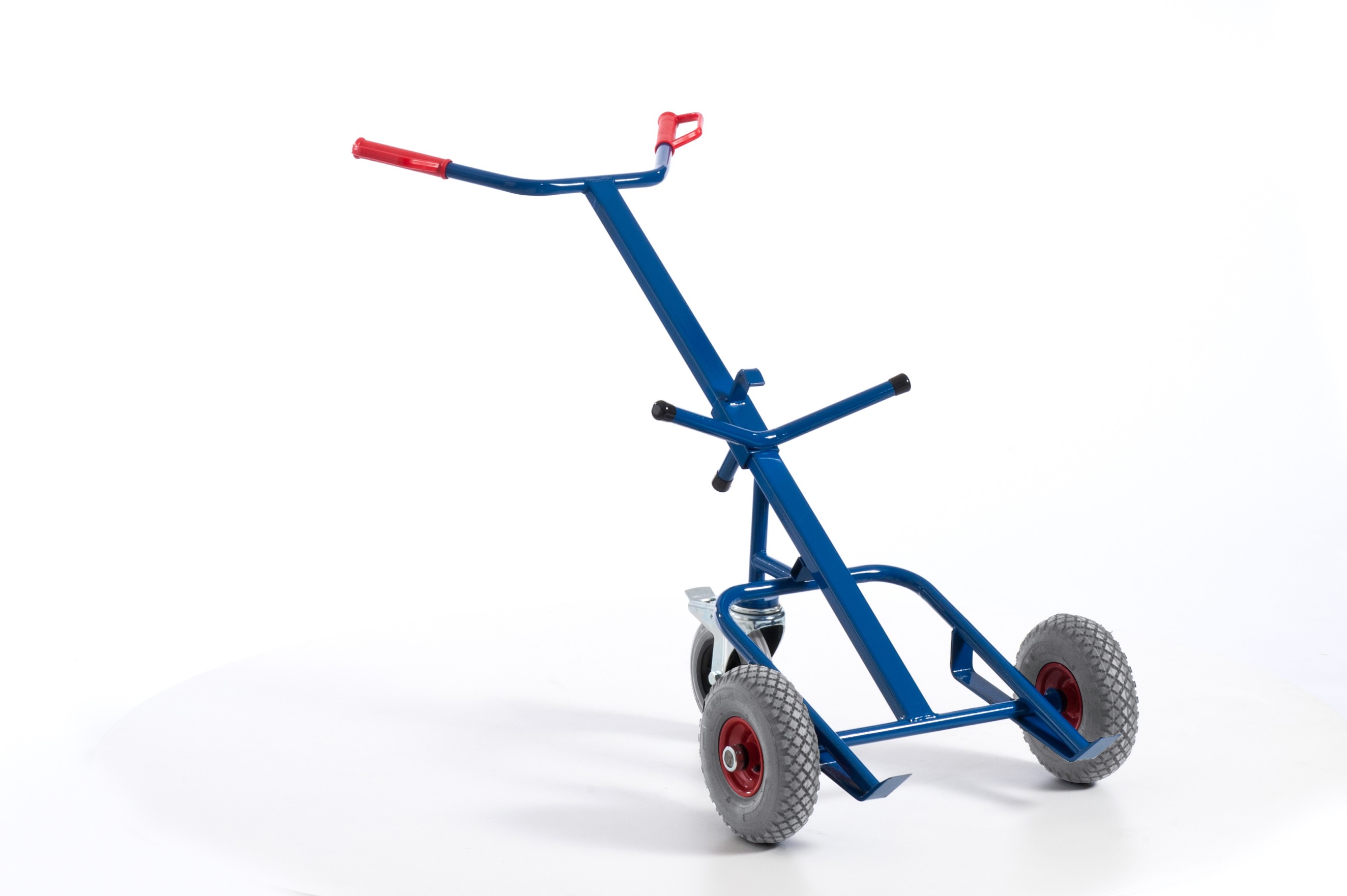 Fest verschweißte Stahlkonstruktion. Die beiden unten an die Karre geschweißten Aufnahmeklauen schieben sich unter das Fass. Nachdem der Fassrandgreifer hinter den oberen Rand des Fasses geklemmt wurde, kann das Fass angehoben werden. Mit Stützrad ist ein sicheres Fahren und Stehenbleiben möglich. Das Fass muss beim Stehenbleiben nicht erst abgestellt werden. Stützrad mit Lenkrolle und Vollgummi-Bereifung Ø 200 mm mit Radfeststeller. Für den Transport von 200 Ltr. Stahlblechfässern mit Rand.Für 200 Ltr. Fässer