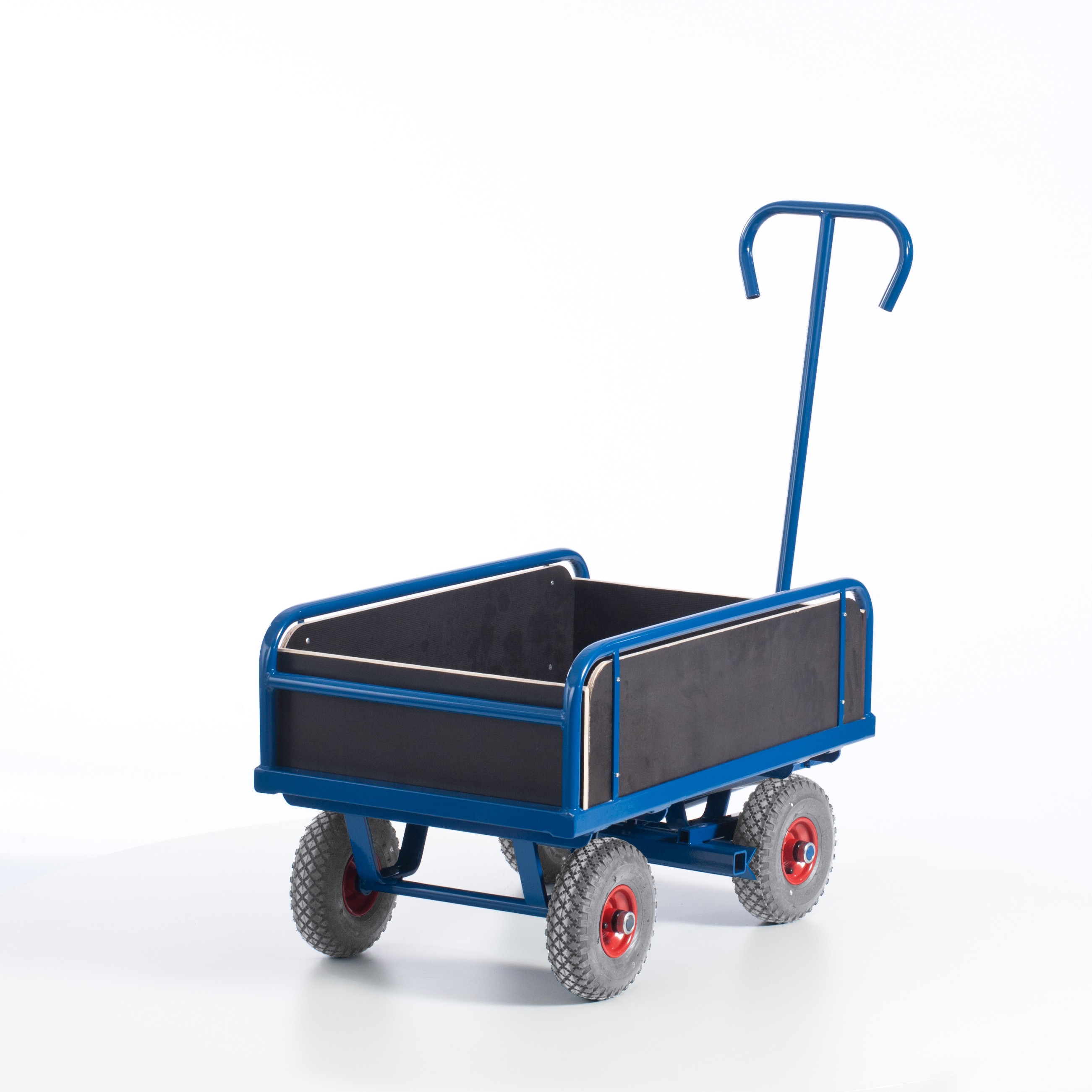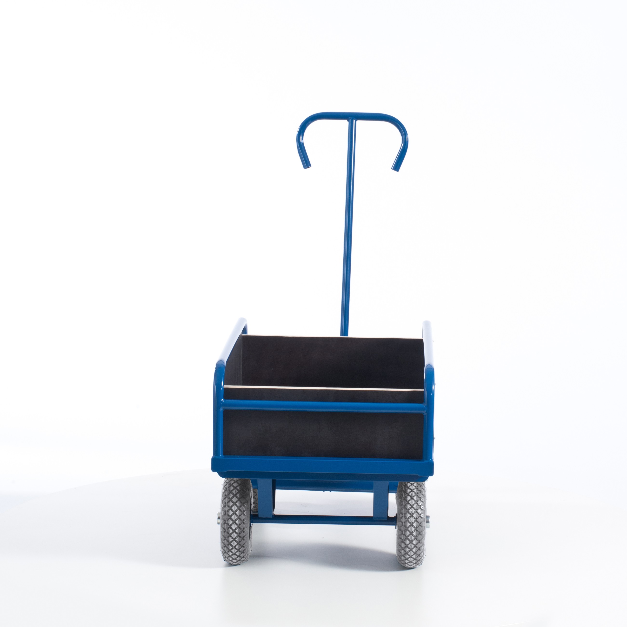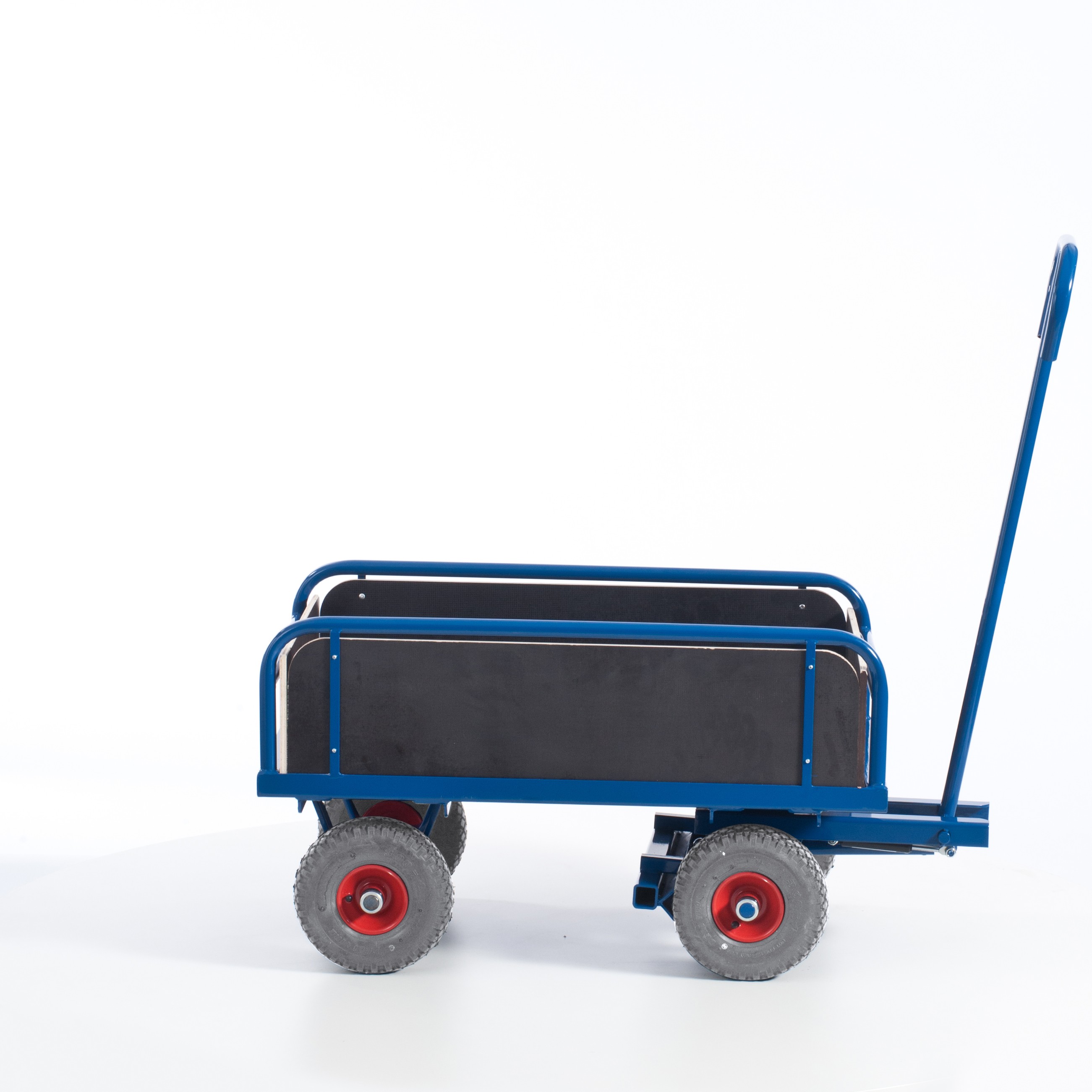 Produktinfo 2-Achs-Handkarre mit Bordwänden: Mit Drehschemel-Lenkung. Deichsel mit Sicherheitshandgriff und automatischer gedämpfer Rückstellung in Ruheposition. Automatische Feststellbremse auf die Vorderräder wirkend.