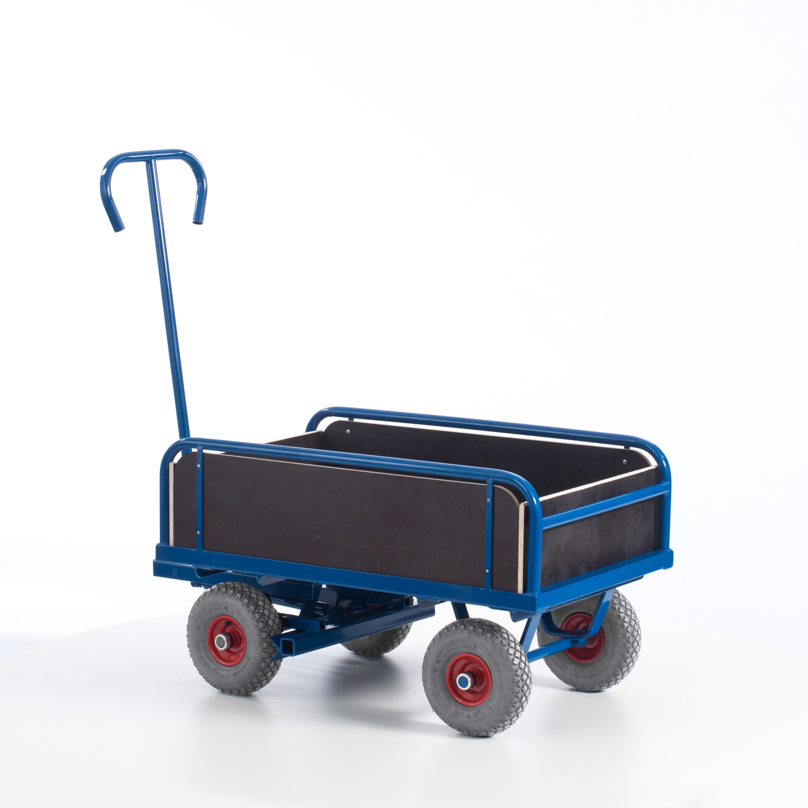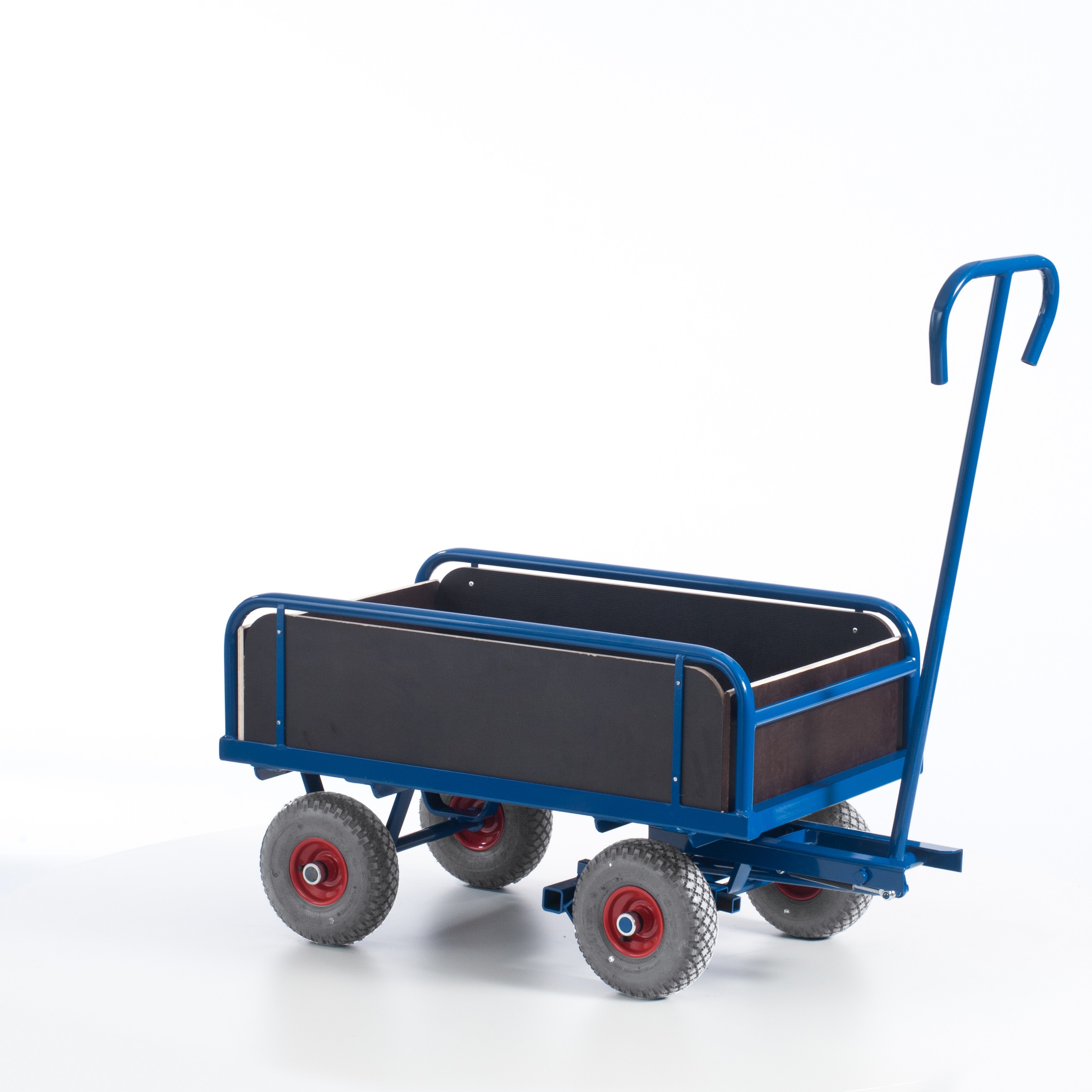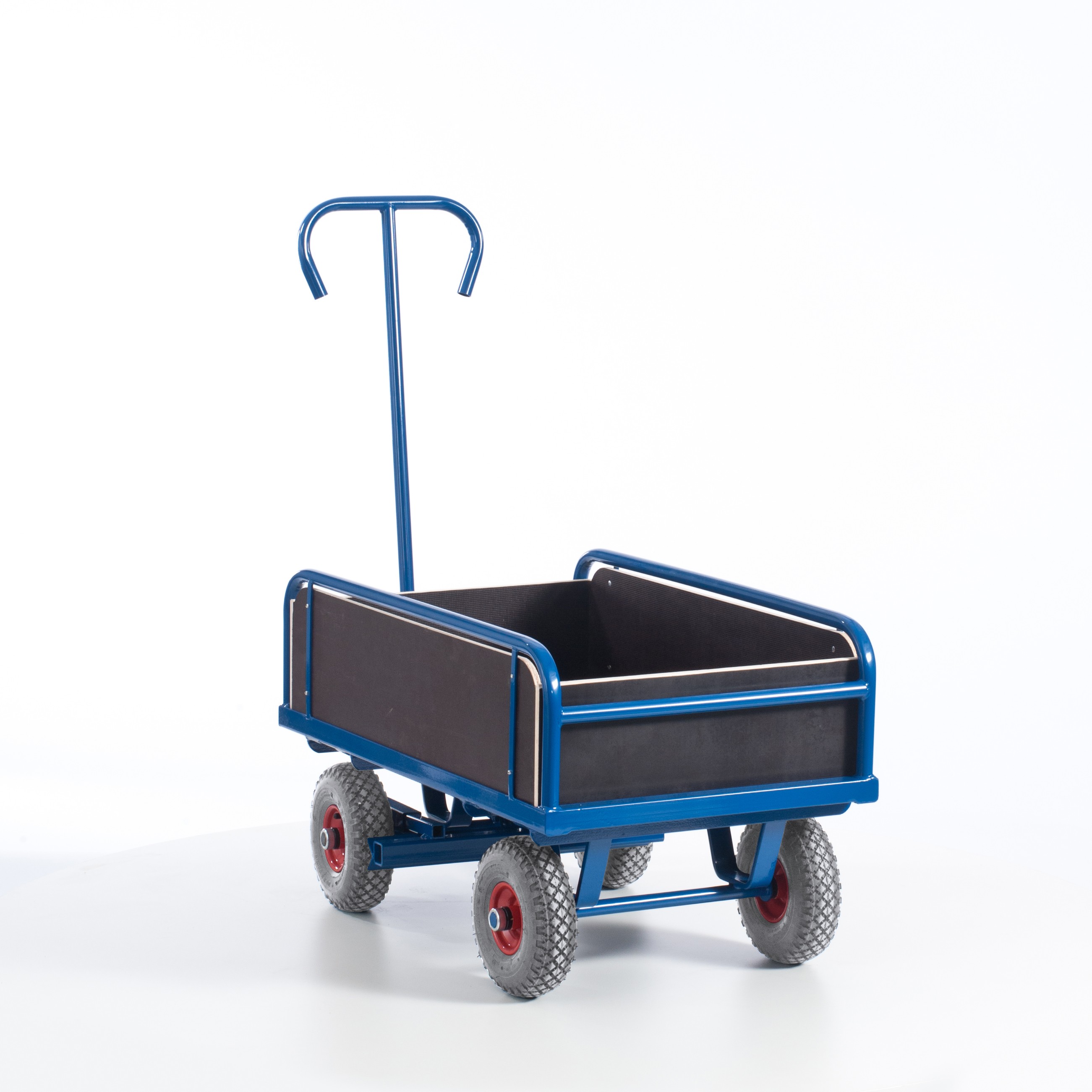 Produktinfo 2-Achs-Handkarre mit Bordwänden: Mit Drehschemel-Lenkung. Deichsel mit Sicherheitshandgriff und automatischer gedämpfer Rückstellung in Ruheposition. Automatische Feststellbremse auf die Vorderräder wirkend.