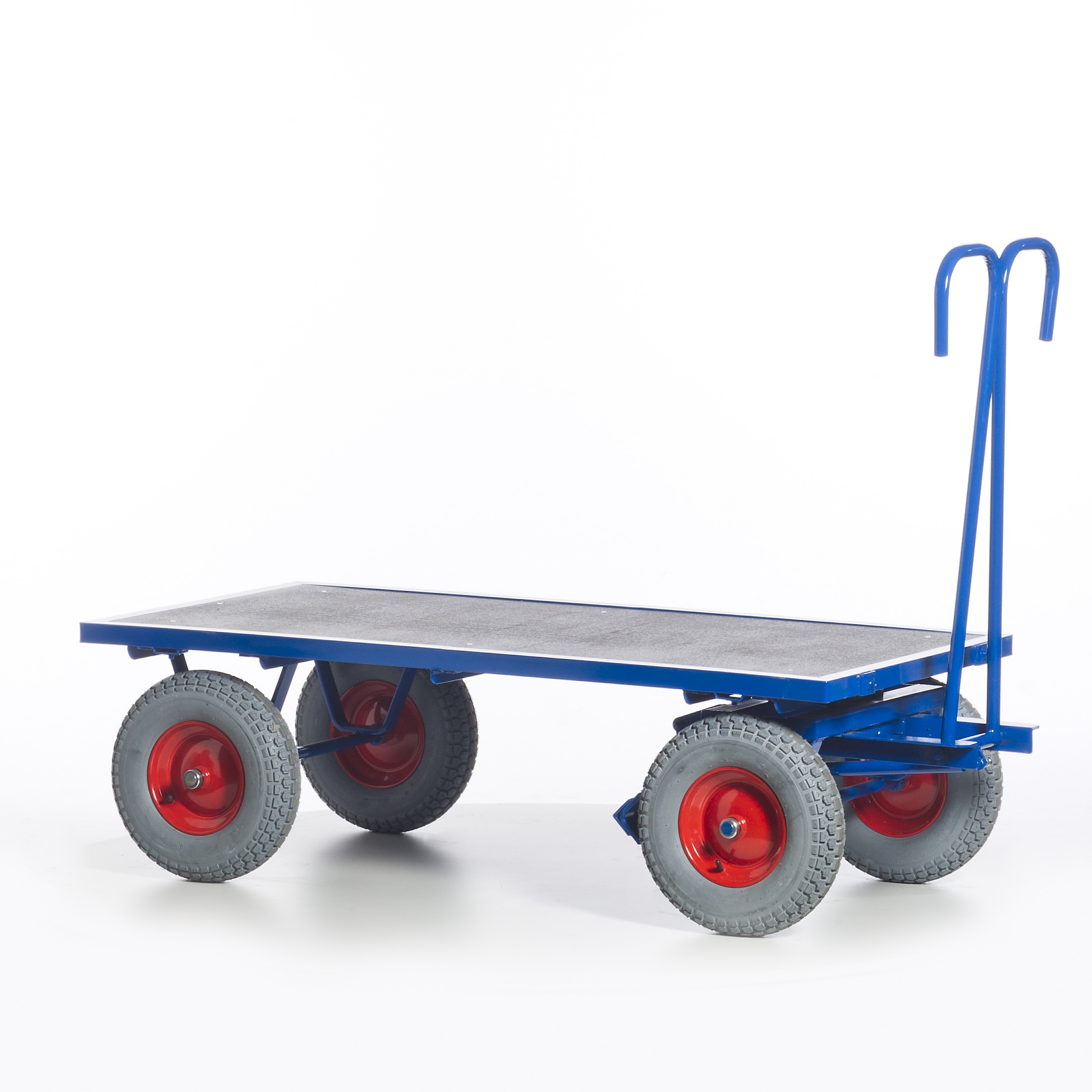 Produktinfo Handpritschenwagen: Mit bündig eingenietetem Ladeboden aus Siebdruckplatte, Drehschemel-Lenkung und Scherendeichsel. Automatische Feststellbremse, auf die Vorderräder wirkend.