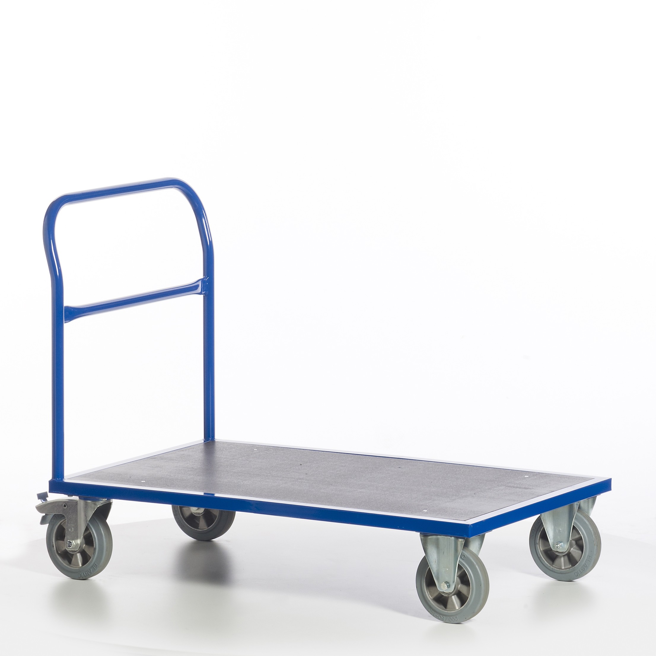 • Lenkrollen mit blaugraue Schwerlast-Vollgummi-Elastik und Kugellager, Gehäuse verzinkt, Feststeller an den Lenkrollen gemäß Europäischer Norm EN 1757-3