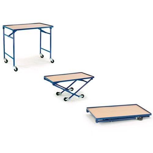 Dieser Tischwagen mit einer Ladefäche von 1000 x 600 mm ist mit wenigen Handgriffen von seiner Nutzhöhe 850 mm auf 150 mm zusammenklappbar. Das Zusammenklappen erfolgt über einen “Federsteckermechanismus”, ohne auch nur eine Schraubverbindung lösen zu müssen. Wagen aus Stahlrohr und Proflstahl, pulverbeschichtet, Ladefäche aus Holzwerkstoffplatte (MDF) mit Buchedekor, 4 Kunststoff-Lenkrollen ø 75 mm, 2 Lenkrollen mit Feststeller gemäß Europäischer Norm EN 1757-3