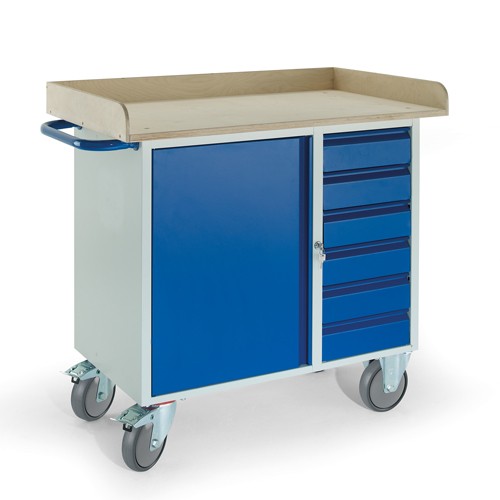 • Werkstattwagen in Stahlblechkonstruktion, Schränke mit 1 festen und 2 variablen Böden, Schubladen mit Gleitführung und Zentralverschluss mittels Zylinderschloss, Belastung 25 kg je Schublade