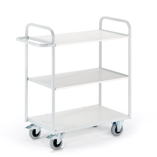 Diese handlichen Etagenwagen sind besonders für den Büro- und Verwaltungsbereich geeignet. Akten und Schriftgut lassen sich griffbereit ablegen, aufbewahren und transportieren. Die Etagenböden sind fest eingenietet und nicht herausnehmbar. Räder mit spurloser Bereifung.