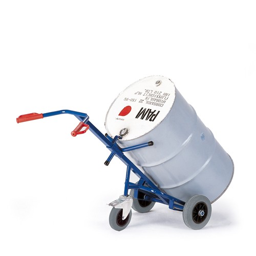 Fest verschweißte Stahlkonstruktion. Die beiden unten an die Karre geschweißten Aufnahmeklauen schieben sich unter das Fass. Nachdem der Fassrandgreifer hinter den oberen Rand des Fasses geklemmt wurde, kann das Fass angehoben werden. Mit Stützrad ist ein sicheres Fahren und Stehenbleiben möglich. Das Fass muss beim Stehenbleiben nicht erst abgestellt werden. Stützrad mit Lenkrolle und Vollgummi-Bereifung Ø 200 mm mit Radfeststeller. Für den Transport von 200 Ltr. Stahlblechfässern mit Rand.Für 200 Ltr. Fässer
