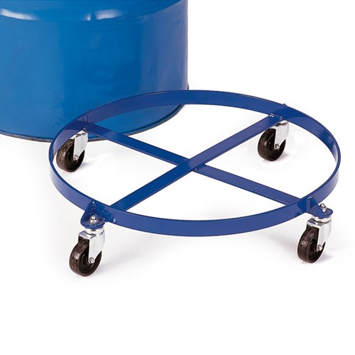 Fassroller für den stehenden Transport von 200-Liter-Fässern. Geschweißte Stahlkonstruktion mit einem Durchmesser von 610 mm und einer Randhöhe von 28 mm. Die Ladehöhe beträgt 140 mm. 4 Lenkrollen mit Polyamidbereifung (schwarz), 2 Stück mit Feststeller gemäß Europäischer Norm EN 1757-3