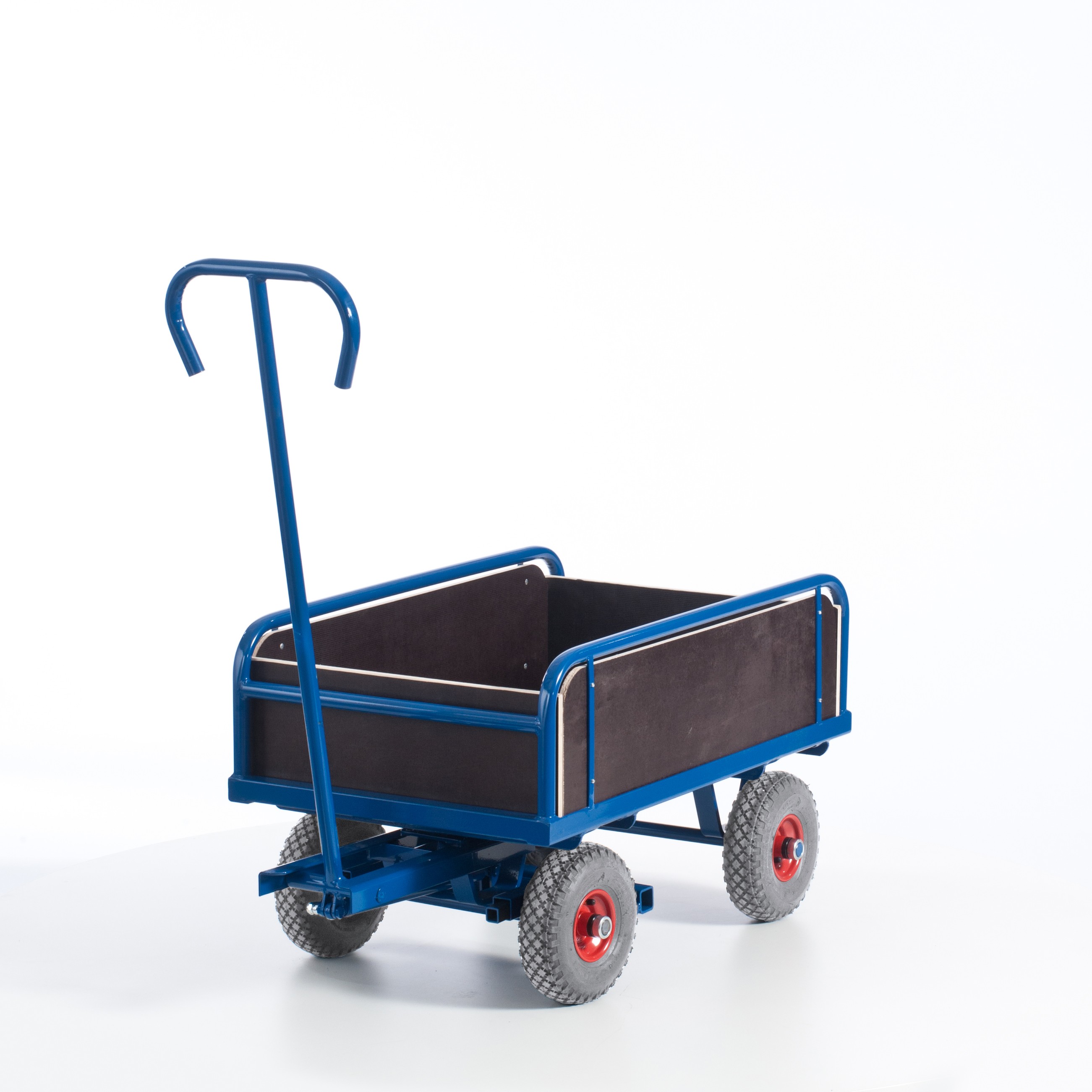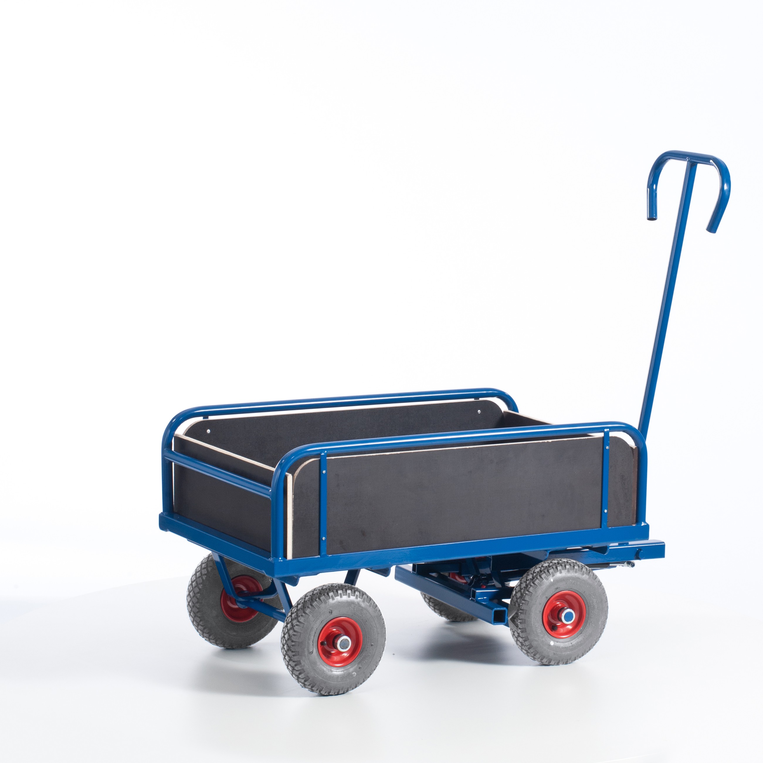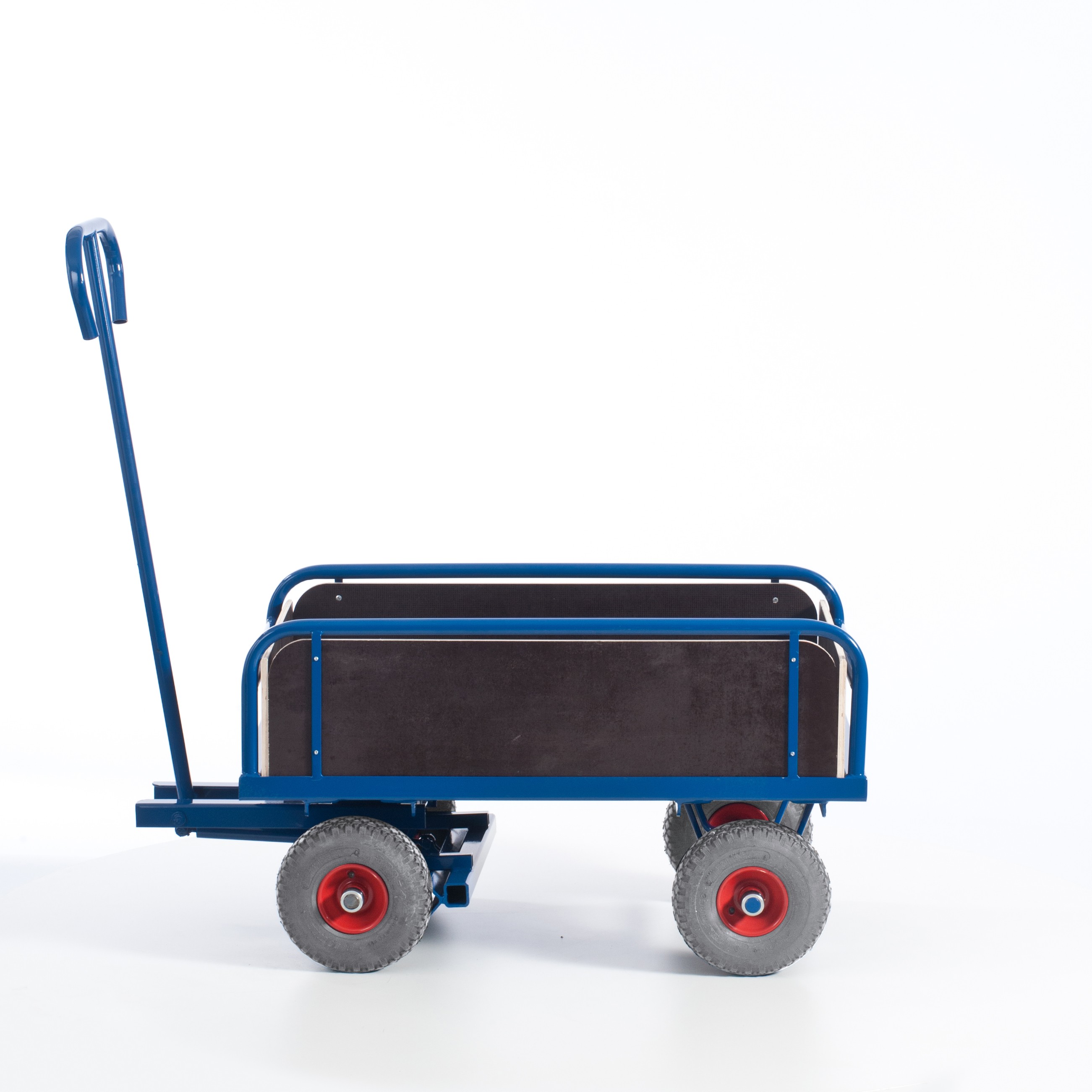 Produktinfo 2-Achs-Handkarre mit Bordwänden: Mit Drehschemel-Lenkung. Deichsel mit Sicherheitshandgriff und automatischer gedämpfer Rückstellung in Ruheposition. Automatische Feststellbremse auf die Vorderräder wirkend.