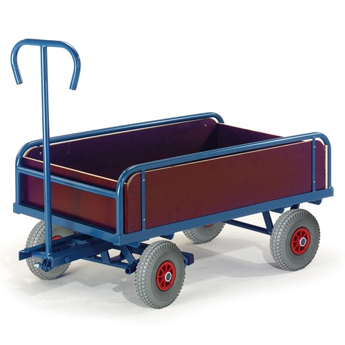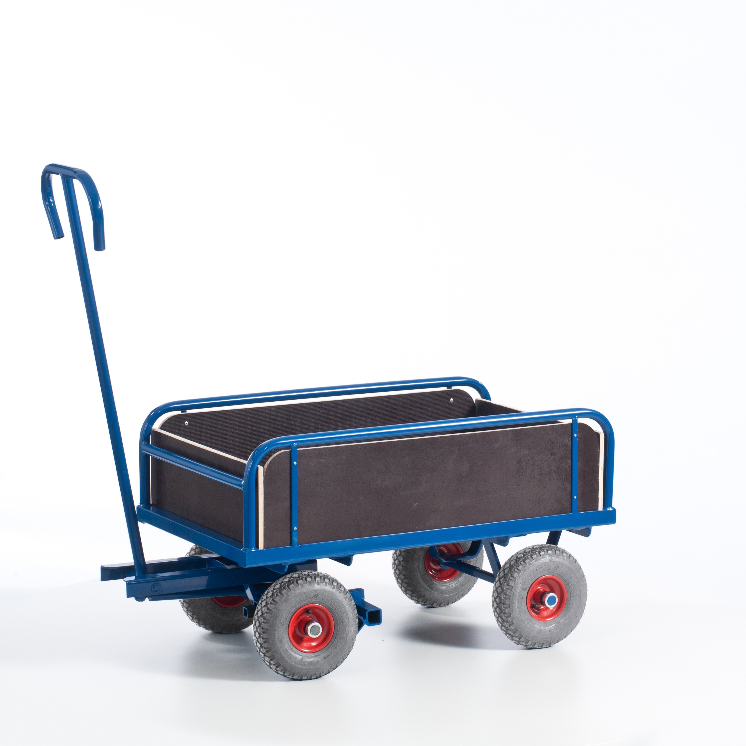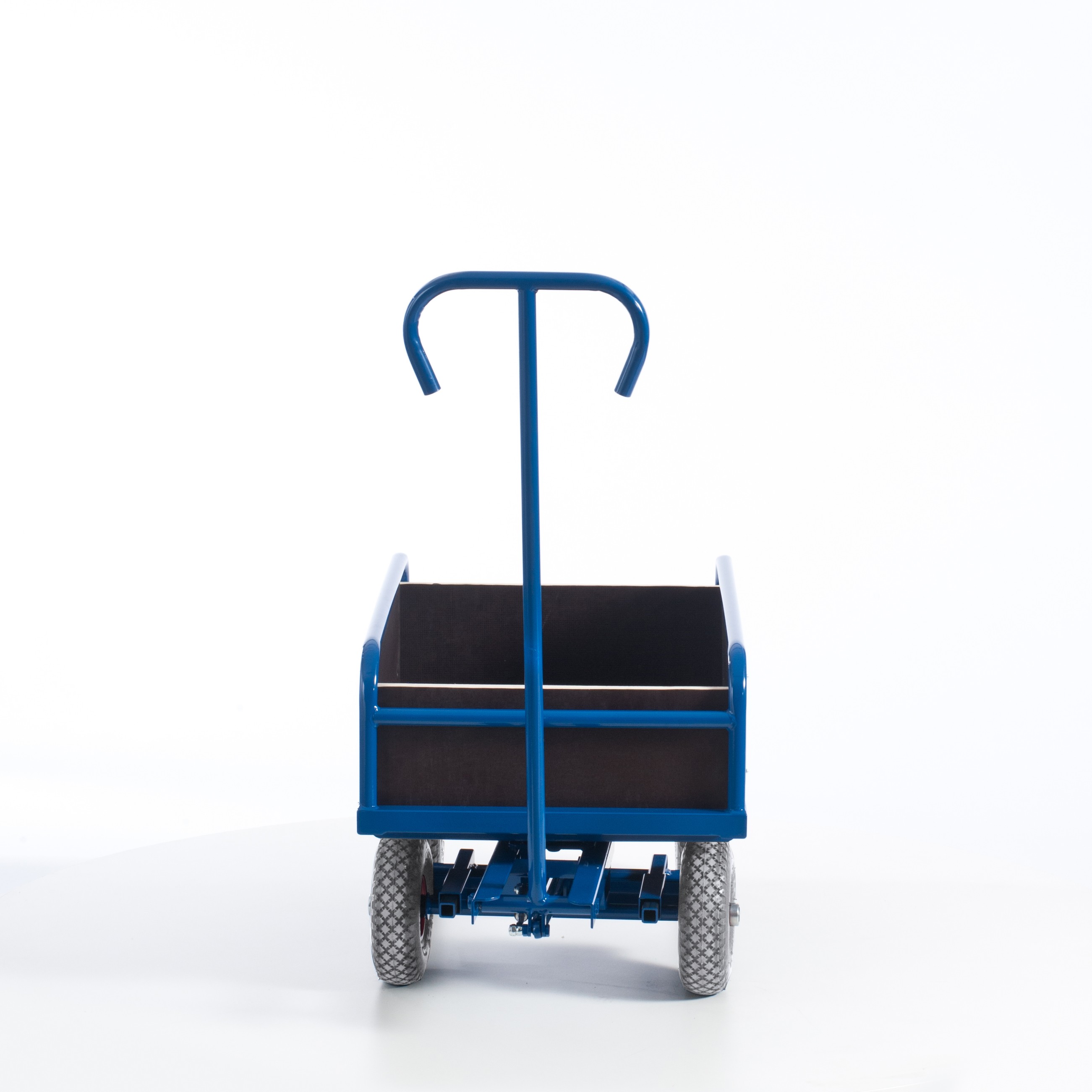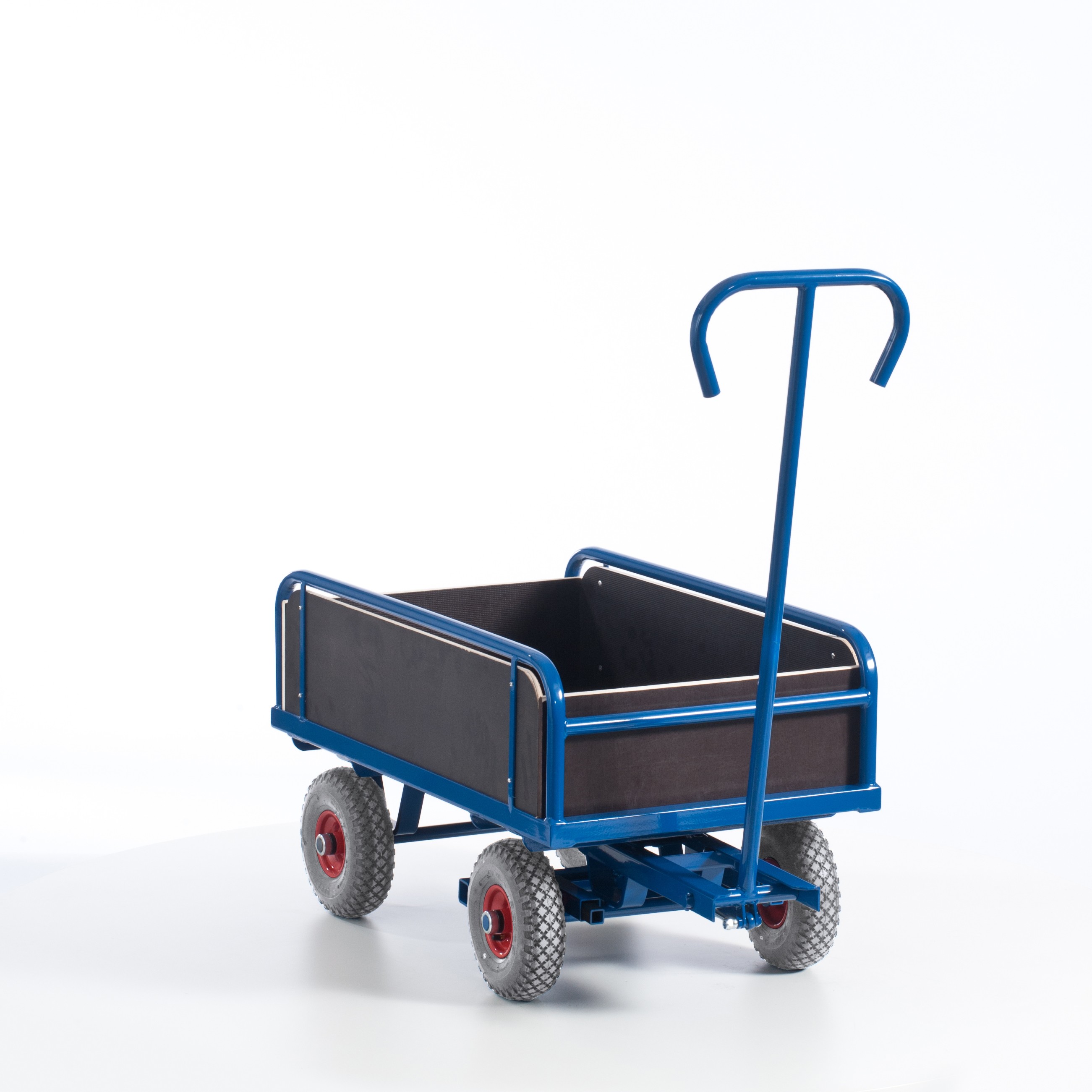 Produktinfo 2-Achs-Handkarre mit Bordwänden: Mit Drehschemel-Lenkung. Deichsel mit Sicherheitshandgriff und automatischer gedämpfer Rückstellung in Ruheposition. Automatische Feststellbremse auf die Vorderräder wirkend.