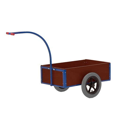 Produktinfo 1-Achs leichte Handkarre: Besonders leicht und doch ein geschlossener Kasten, in dem sich vieles transportieren lässt. Die Deichsel ist mit wenigen Handgriffen zu lösen. Ladefläche und Bordwände aus Siebdruckplatte.