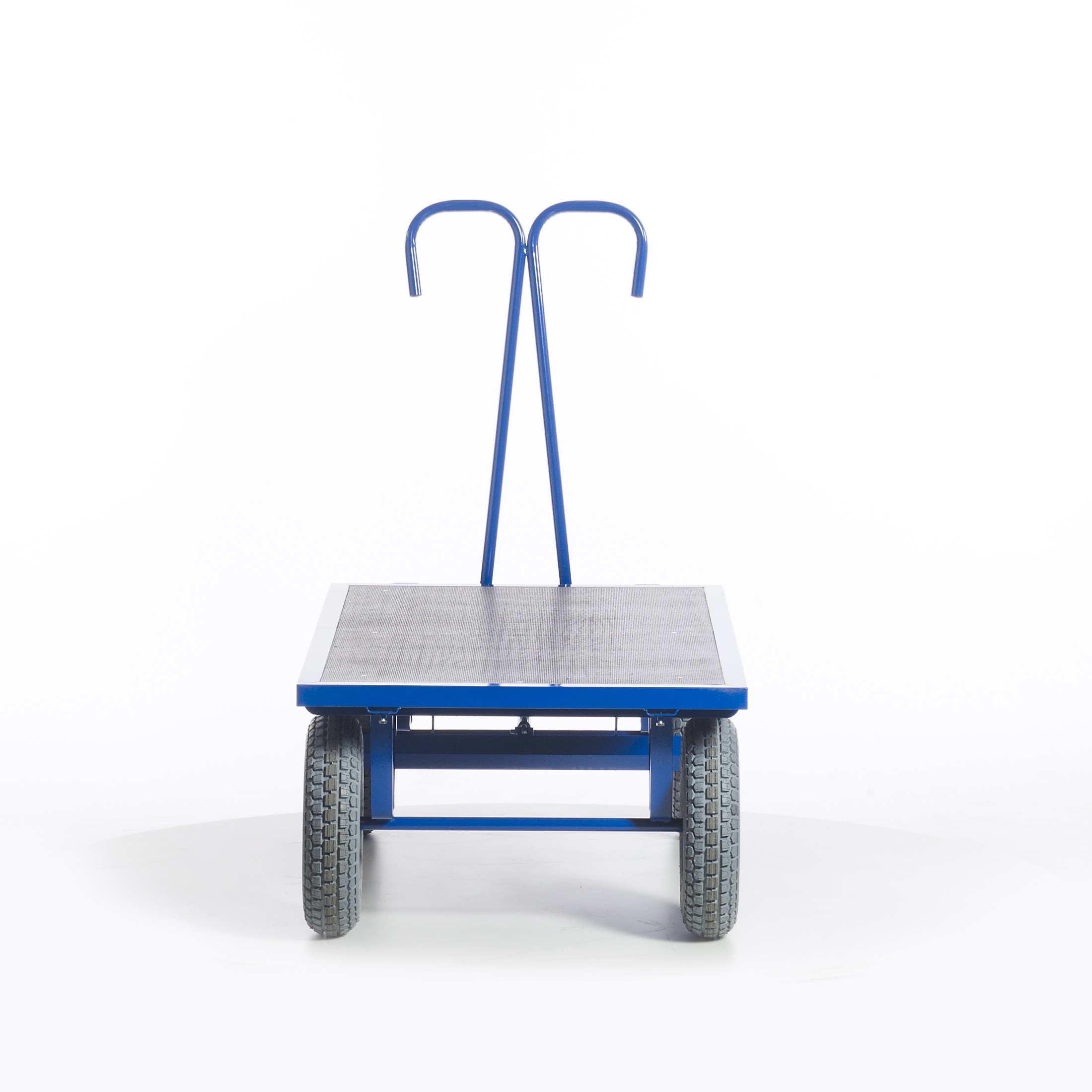 Produktinfo Handpritschenwagen: Mit bündig eingenietetem Ladeboden aus Siebdruckplatte, Drehschemel-Lenkung und Scherendeichsel. Automatische Feststellbremse, auf die Vorderräder wirkend.
