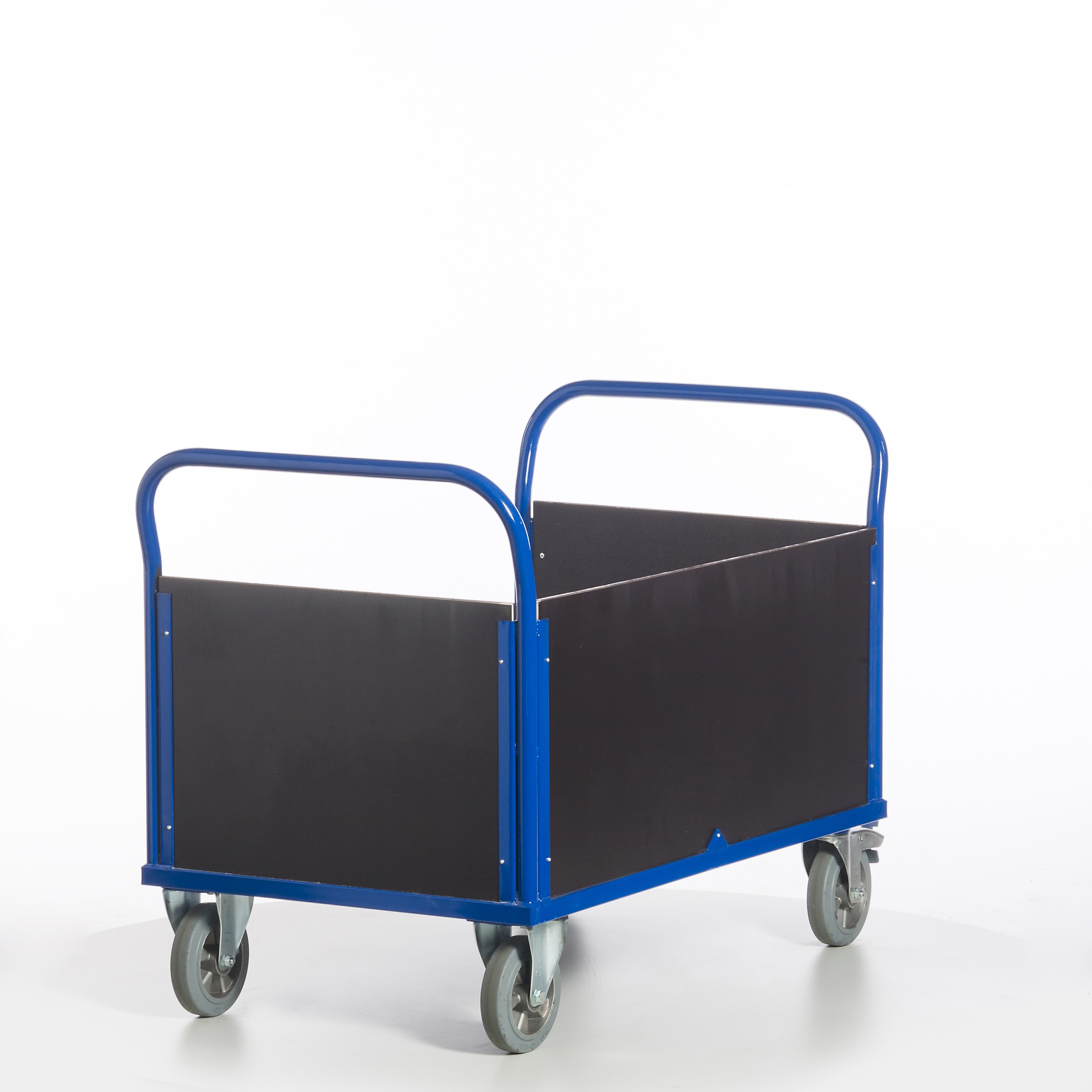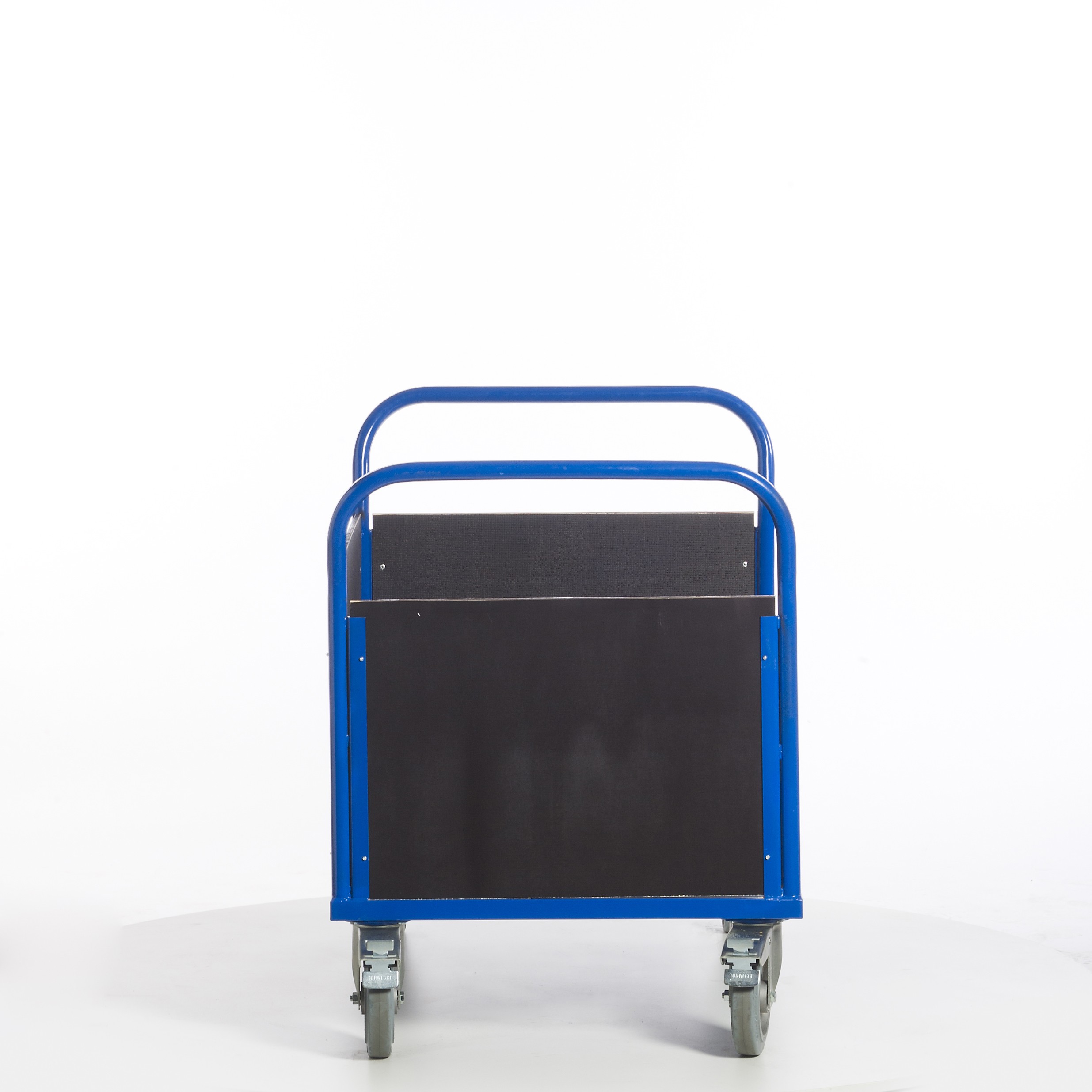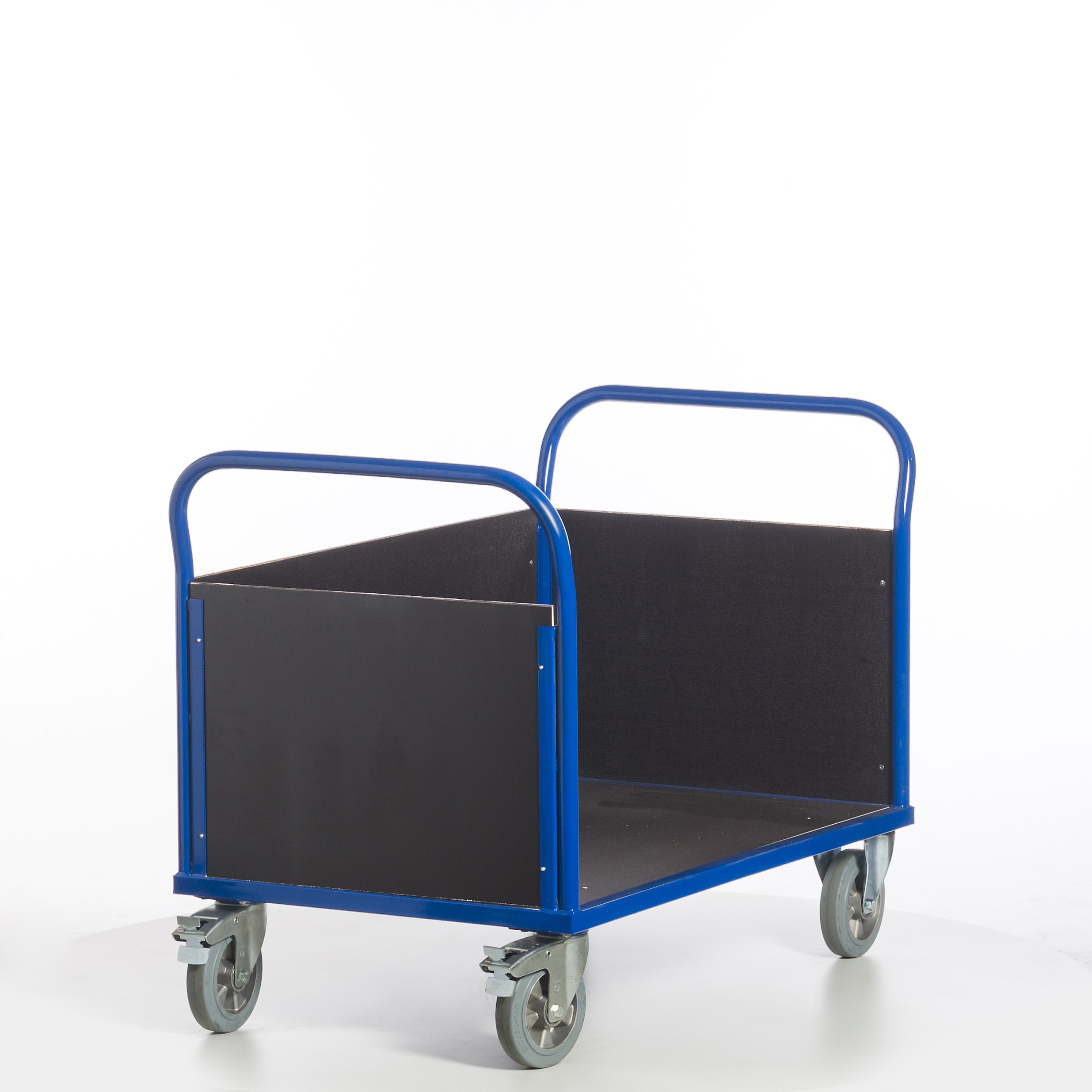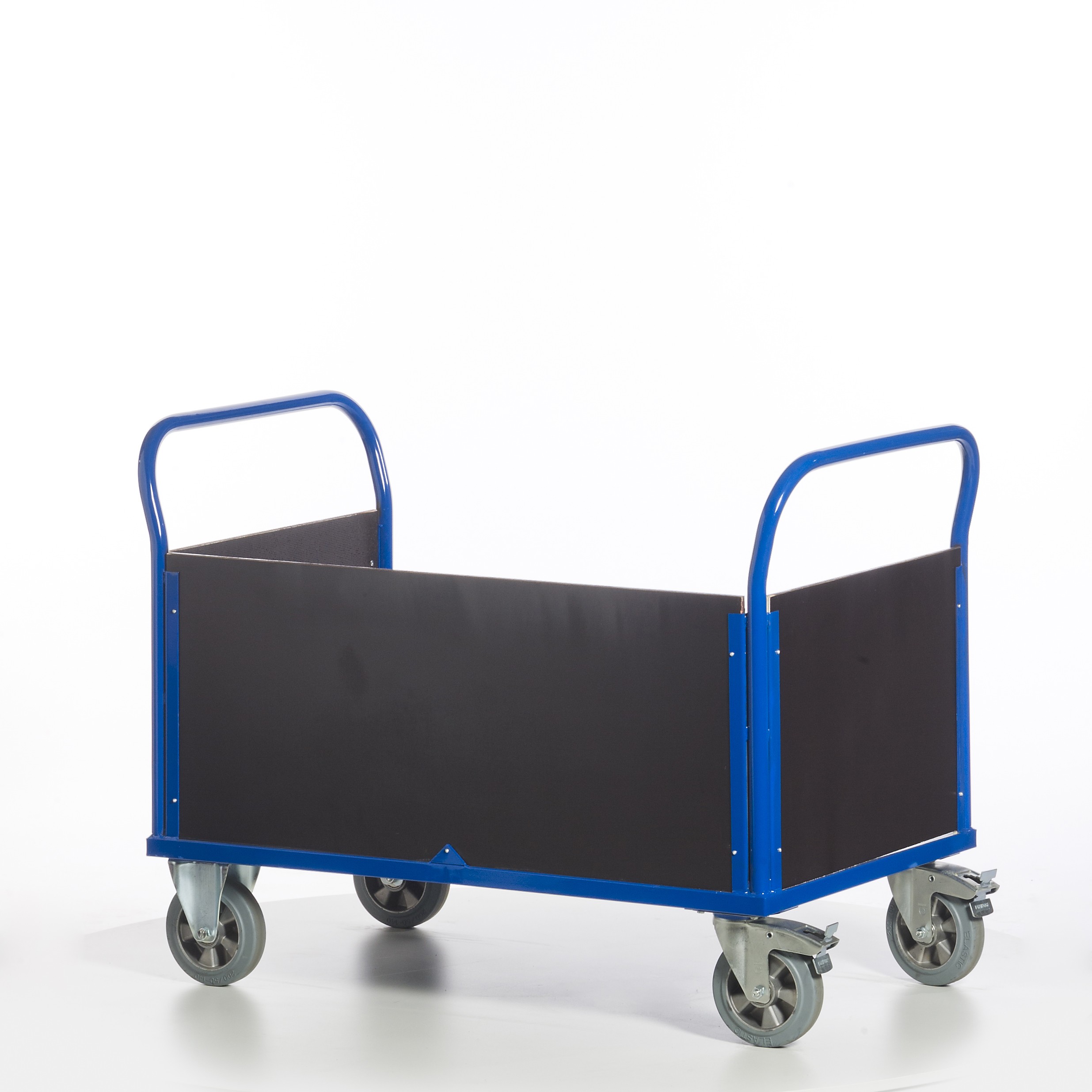 • Lenkrollen mit blaugraue Schwerlast-Vollgummi-Elastik und Kugellager, Gehäuse verzinkt, Feststeller an den Lenkrollen gemäß Europäischer Norm EN 1757-3