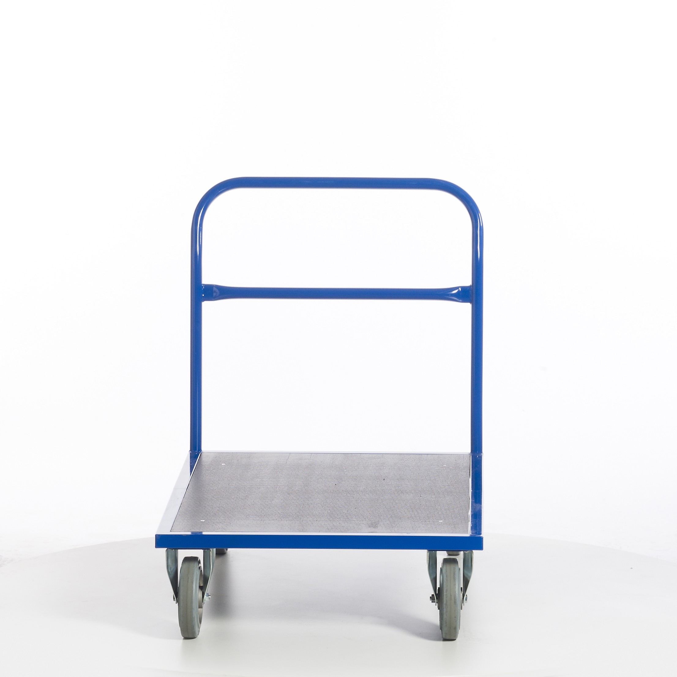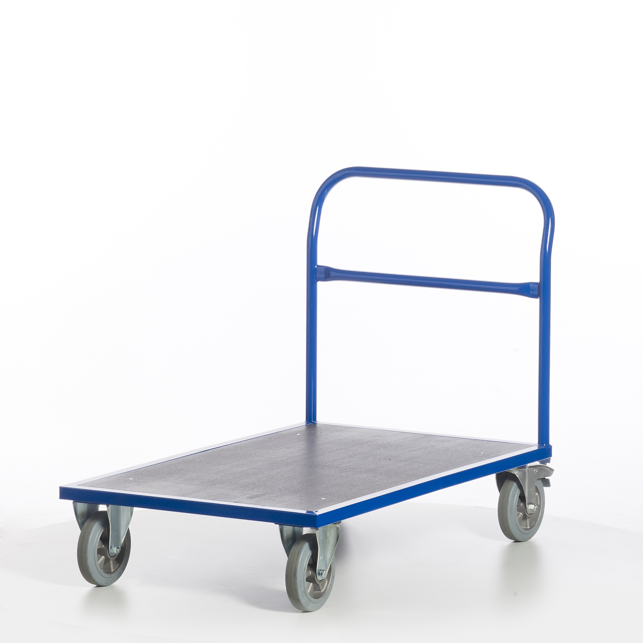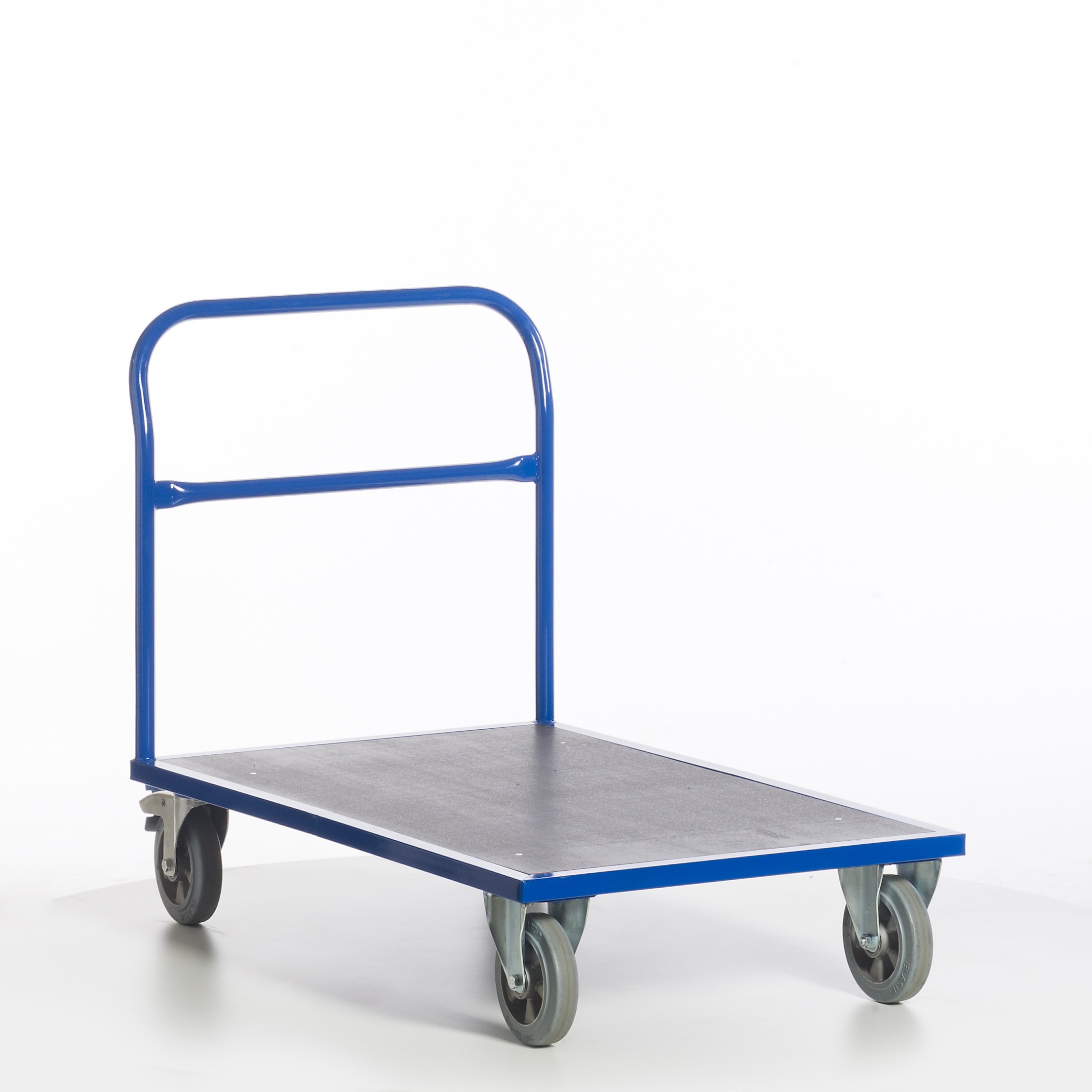 • Lenkrollen mit blaugraue Schwerlast-Vollgummi-Elastik und Kugellager, Gehäuse verzinkt, Feststeller an den Lenkrollen gemäß Europäischer Norm EN 1757-3
