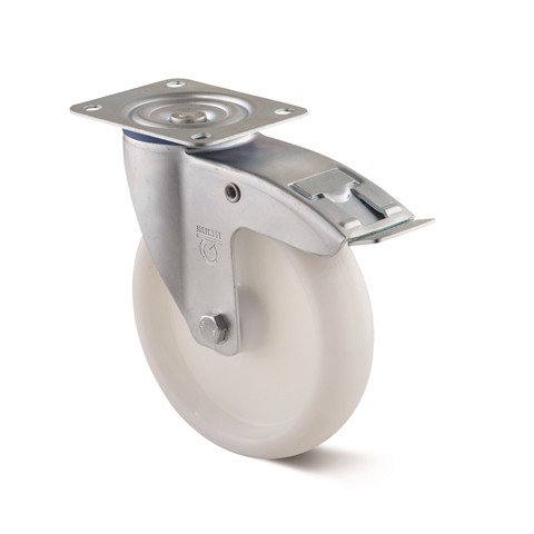 Räder: Radkörper aus hochwertigem Polyamid 6 mit Rollenlager, Bruchsicher bei hoher Belastung, Geringer Rollwiderstand, Chemische- /Temperaturbeständigkeit -40°C bis 90°C, Gehäuse: Standard Stahlblechgehäuse, verzinkt,