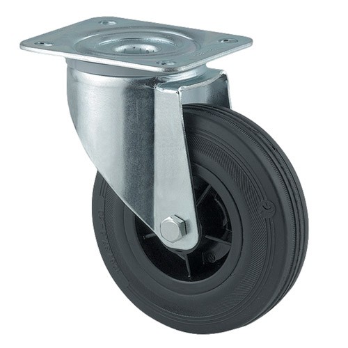 Räder: Radkörper aus Kunststoff mit Rollenlager, Lauffläche aus Standard-Vollgummibereifung, schwarz , ca. 80° - 85° Shore A-Gehäuse: Standard Stahlblechgehäuse, verzinkt, Gabelkopf mit zweifacher Kugellagerung, Abdichtung mit integriertem Kugelabstandshalter