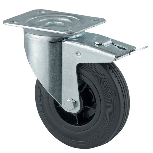 Räder: Radkörper aus Kunststoff mit Rollenlager, Lauffläche aus Standard-Vollgummibereifung, schwarz , ca. 80° - 85° Shore A-Gehäuse: Standard Stahlblechgehäuse, verzinkt, Gabelkopf mit zweifacher Kugellagerung, Abdichtung mit integriertem Kugelabstandshalter