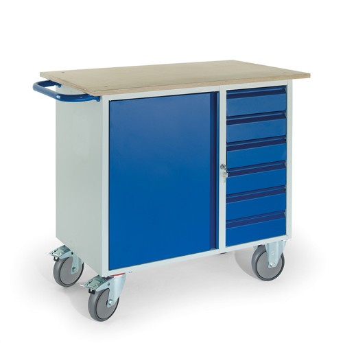 Werkstattwagen in Stahlblechkonstruktion, Schränke mit 1 festen und 2 variablen Böden, Schubladen mit Gleitführung und Zentralverschluss mittels Zylinderschloss, Belastung 25 kg je Schublade